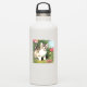 Sticker featuring a vintage kitten illustration. A fluffy white cat with dark stripes plays in a patch of grass with red flowers. A cute gift for cat lovers and Victorian art collectors.