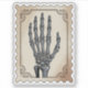 This distinctive postage stamp features a detailed illustration of a skeletal hand, rendered in shades of grey, set against a parchment-like background with intricate vintage scrollwork in the corners. The design evokes a classic, slightly eerie aesthetic, perfect for adding a touch of macabre elegance to Halloween correspondence, gothic-themed mail, or for collectors of unique and antique-inspired stamp designs