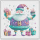 Un alegre Santa Claus vestido con una vibrante vestimenta violeta sostiene alegremente regalos coloridos en ambas manos.
