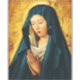 El fondo claro y oscuro contrasta con la cabeza inclinada radiante de la Virgen y el frente blanco que la cubre, y sus manos están cerradas suavemente juntas