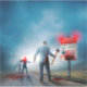 SlipperyJoe's feliz Halloween brillantes ojos zombis brote señal de cuarentena figura de sobreviviente masculino está en primer plano infección por gases máscara aviones aterrizar manchas de sangre misteriosas figuras post-apocalípticas mundo infectado zombie armado con martillo para combatir artística tormenta oscura paisaje desolado LGBTQIA regalos de orgullo gay