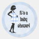 El diseño es una silueta de una futura madre que lleva un vestido azul y blanco con la mano en el vientre de su bebé. La frase '¡Es una baby shower!' está escrita en negro. Esta pegatina coordina con anuncios, invitaciones para baby shower y más encontrados en mi tienda. Perfecta para agregar ese toque final al sellar el sobre.