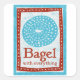 El Bagel With Everything in blue and red cuenta con un bulto con estampado ocupado, con un marco de punto de polka en madera, al estilo de linocut.