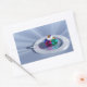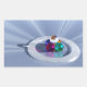Una imagen en 3D creada en Vue, llena de reflejos y luces brillando desde todas direcciones. Cinco esferas de colores de vidrio azul, rosa, turquesa, naranja y diamante se asientan en una pirámide rodeada por un anillo blanco translúcido. Se sientan sobre un fondo alucinante de rayos azul y blanco pálidos que convergen justo debajo de las cinco bolas de cristal.