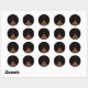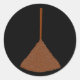 Esta hoja de pegatinas redondos muestra una imagen de un Besom anticuado, o escoba de brujas. El besom es marrón y está cubierto de muchas ramas. El fondo es negro.