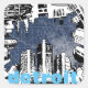 Divertido Detroit pegatinas temáticos con el fondo del mapa del estilo de impresión azul antiguo y mi boceto de tinta en primer plano.