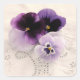 foto de tres pansies en tonos morados sobre un delicado tejido de tela