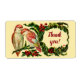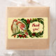Este es un diseño encantador y vintage que presenta dos hermosas aves de amor sentadas en la rama de un árbol de bayas con una corona contra un fondo amarillo cremoso y el texto dice: ¡Gracias! en escritura roja dentro de la corona.