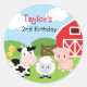 Pegatinas amables para la fiesta de cumpleaños / ducha de bebé en la temática de los animales de granja, con fondo de punto de polka azul.