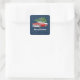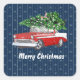 Bonito Feliz Pegatinas navideños con auto rojo vintage cargando un árbol de Navidad en un fondo azul bonito con copos de nieve