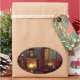 Un acogedor rincón de lectura en un día lluvioso de otoño. Alrededor de la chimenea hay unos sillones rojos mullidos, con pilas de libros y tartas y una tetera para completar el confort. En el exterior, un sauce amarillo y una cubierta roja de arce y hayas se ven oscurecidos por la lluvia que sopla la ventana, donde un gato jengibre se sienta mirando hacia afuera.