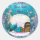 Sirena de pegatinas de ducha de bebé con una adorable sirena afroamericana usando una tiara y perlas en un verde azulado azul y morado bajo el fondo del mar. Puedes agregar texto para personalizar a estas lindas sirenas étnicas pegatinas de ducha de bebé.