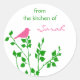Pegatinas preparadores de cocina con adornos y extravagantes, con un pájaro rosado sobre ramas verdes de árboles. Moderna y moderna, desde la cocina de etiquetas para productos horneados y enlatados.