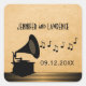 Las pegatinas de bodas de vinilo en negro con una silueta de un gramófono anticuado con notas musicales a la deriva sobre un fondo de papel con texturas de arte digital. Este diseño boda de moda fácil de hablar sería perfecto para un boda temático de los años 20. Fácil de personalizar, simplemente agregue los detalles de su boda en las plantillas de texto proporcionadas. Haga clic en el botón "Personalizar" para encontrar opciones de personalización adicionales.