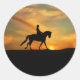 ¡Tú también puedes personalizar a estos pegatinas! Una hermosa salida del sol, un jinete y un caballo se sientan a la luz.