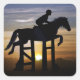 Hermosos pegatinas de arte de un caballo saltando sobre un salto al amanecer con un jinete. Muestra cómo están sincronizados. pegatinas de caballos de bonito