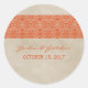 Sencillas y elegantes pegatinas rusticas de bodas de encaje con un fondo de papel texturizado vintage y un borde de encaje dulce y delgado en naranja. Fácil de personalizar, simplemente añada los detalles de su boda. Haga clic en "Personalizar" para encontrar más opciones de personalización.