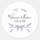 Pegatina Boda de Lavanda de Campo. Diseñado con flores de lavanda pintadas a mano con color púrpura con estilo de acuarela. Se trata de un diseño de estilo rústico para bodas de primavera, verano y al aire libre. Personalizar este diseño con la fecha de su boda y los nombres de su novia y novio. El color de fondo está establecido en blanco, aunque puede elegir el color de relleno que desee.