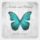 Pegatina Boda elegante y sencillo con una mariposa verde azulada sobre un fondo gris. Este diseño es una elección única para un boda moderno. Fácil de personalizar con los detalles de su boda. Haga clic en "Personalizar" para encontrar más opciones de personalización.