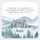 Elegantes montañas rústicas de acuarela y bodas de la escena del bosque pegatinas de la etiqueta de la dirección, con frondosos árboles azules y verdes y montañas con un texto de guión: que comience la aventura. Para los que aman un romántico y soñador bosque, vivirán por su ceremonia y celebración. Para ver la colección completa de materiales coincidentes para este diseño, visite: https://www.zazzle.com/collections/rustic_forest_mountain_wedding-119965625201006103