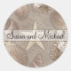 Hermosos stickers de bodas con temática de playa, con una estrella de mar en el centro. Una línea blanca sostiene los nombres de la novia y del novio. El fondo es de arena natural, con numerosas conchas marinas. Borde marrón de chocolate. Los pegatinas tropicales divertidos se pueden personalizar instantáneamente.