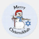 Estos son pegatinas divertidos que puedes usar en tus envíos de correo, para decoraciones, o para acompañar el ajuste de regalo correspondiente. El diseño muestra a mi personalizado snowman que lleva puesto un sombrero de Santa y un pañuelo azul pero también sostiene una estrella de David y un bastón de caramelo. Combina los símbolos judío y cristiano. El texto de este pegatina se puede cambiar si lo desea para un propósito diferente. Debido al estilo de diseño, sólo funciona con pegatinas ROUND. Diseñado por Sheila Cicchi, Brownielocks.com. Todos Los Derechos Reservados.