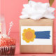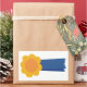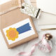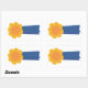 Pintura de una cinta de premiación azul y naranja, impresa en pegatinas. La parte superior tiene una flor tipo naranja, con dos cintas azules reales colgando de ella.