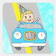 Niño montando en un auto azul convertible. Ideal para sellar invitaciones para fiestas de cumpleaños o bolsas de regalos de caramelo.