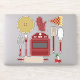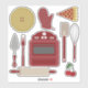 Pegatinas con un tema de cocina de torta roja que incluye fogones, tenedor, espátula, alfiler, manto de horno, servidor de tartas, whisky, cerezas, tarta y rebanada de pastel.