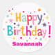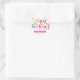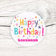 Este diseño de pegatina circular presenta un vibrante saludo de "¡Feliz Cumpleaños!" rodeado de una nostálgica explosión de estrellas coloridas y puntos de confeti. Los elementos festivos en teal, naranja y púrpura resaltan contra el fondo blanco limpio, dándole un ambiente divertido y retro de fiesta. En la parte inferior, un nombre específico está impreso en una fuente rosa negrita, lo que hace que la etiqueta se sienta única y personal para el destinatario. Estas pegatinas son una forma simple y alegre de decorar bolsas de regalo, sobres o recuerdos de fiesta con un clásico estilo retro. Los colores brillantes y las formas juguetonas crean un aspecto de alta energía que hace que cualquier celebración de cumpleaños se sienta aún más especial.