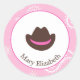 Pegatinas de vaquera rosadas que hacen un sello festivo para bolsas de caramelo limpias o usan pegatinas más grandes en la parte delantera de las bolsas. Este pegatina tiene un fondo de bandana rosada con un gorra de vaquero marrón con una banda rosa. Personalizar con nombre de chicas fiestas.
