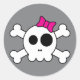 Este calavera adorable y los huesos cruzados tienen un brillante arco rosado. Pegatinas para emo, punk o chicas de gótico de todas las edades.