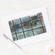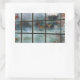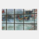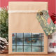Un frío paisaje otoñal visto a través de una ventana de escarcha temprano una mañana. Pinos y pinos con hielo blanqueando sus agujas, armazones en tonos rojos, naranjas y amarillos, de hierba blanquecina helada vista a través de la niebla, saliendo de un arroyo oculto. Las hojas de rosa rojas y verdes que ondean la ventana a cada lado.
