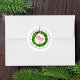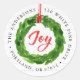 Elegante y rústico domicilio de regreso de vacaciones pegatinas con una corona de color verde de agua colgada por una cinta roja con "Alegría" en un guión rojo contra un fondo blanco de shiplap. Personalice las etiquetas de las direcciones de retorno festivas agregando su nombre y dirección.