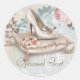Pegatinas de duchas de novias con calzado de tacón alto con champán de bonito y almohada elegante en un fondo de bonito. Estos pegatinas de ducha de novias se personalizan fácilmente con texto. Puede cambiar la posición del fondo y también puede eliminar el fondo y agregar un color de fondo sólido.