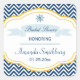 Este pegatina cuadrado redondeado Bridal Shower personalizado tiene un tema náutico. En el fondo, un patrón de zigzag de chevron azul marino y blanco con un marco curvado dorado y blanco en el medio. En la parte superior hay un volante de barco azul marino con un corazón en el medio. Debajo, Bridal Shower está escrita con un tipo de letra cursiva en una suave bandera azul. A continuación, se puede personalizar el nombre de la novia junto con la fecha de la ducha. Mercado gráfico de derechos de autor