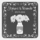 El popular pegatina boda de estilo pizarra es por rollo con el borde del corazón y un ilustracion original de un frasco de masón de moda con flores de crisantemo blanco y un corazón personalizado con las iniciales de la novia y el novio con un efecto tiza. La tipografía caprichosa le da al pegatina un aspecto casualmente elegante. También hay elementos de coordinación disponibles. Algunos gráficos de clipartSingles en la tienda etsy.com