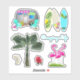 Pegatinas con forma de camping tropical. Un pequeño RV plateado con sillas, tres tablas de surf, una palmera, flores y flamencos de césped son los diseños de cada hoja. Una línea de texto, "Camping Life" puede ser cambiada. Decorar páginas de álbumes para conmemorar un viaje de vacaciones o de acampada en la playa de Florida. Elija cualquier hoja de tamaño para los tamaños de pegatina necesarios.