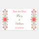 Una pegatina de guardar la fecha personalizada con un grabado de una marca de impresor vintage de un escudo decorado y un diseño floral de margaritas y hojas rizadas en rojo y dorado, restaurado de un manuscrito antiguo.