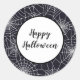 Un pequeño pegatina redondo se muestra en una imagen de telaraña de Halloween. Personalizar este artículo o compra tal cual.