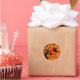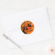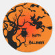Pegatinas De Halloween De Brujas Y Lechuzas. Una bruja sobre un palo de escoba, un búho sobre un árbol espeluznante y murciélagos sobre el fondo naranja.