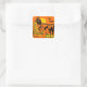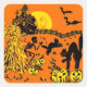 Pegatinas cuadrados con una vintage escena tradicional de Halloween de gatos, murciélagos, calabazas, casa embrujada.