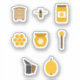 Un conjunto de pegatinas para apicultores o amantes de la abeja. Incluye colmena, abeja, olla de miel, ahumador de abejas y cuchara de miel.
