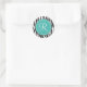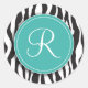 Este adorable pegatina cuenta con un fondo de impresión de cebra en blanco y negro. En la parte superior hay un círculo verde azulado con un borde blanco. Personalizar la letra dentro del círculo para personalizar el producto.