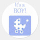 Una hoja de pegatinas blancos y azules de bonito para acompañar el nacimiento de tarjetas de invitación para niños de recién nacido, con un viejo diseño de proa, de un collage de papel de Judy Adamson.