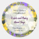 Jabón personalizado, pegatinas de hornear o de oficio con escritura morada y letras de bloques negros sobre hermosos violetas botánicas moradas, amarillas y azules y flores de color marrón.