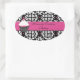pegatinas ovalados de bonito, con fondo damasco blanco y negro y una atrevida banda rosa, en el medio, con un quequitos caprichoso, en el lado izquierdo. El texto en negro es totalmente personalizable para tu negocio. Ideal para panaderías, panaderías y decoradores de pasteles, para usar como focas en cajas de pasteles y otros empaques. Personalice su negocio.