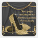 La fiesta de cumpleaños de las mujeres con zapatos altos de tacón negros y dorados favorece a los pegatinas con hermosos zapatos altos de tacón purpurina de oro sobre un fondo negro y dorado de cortina. Este elegante pegatina de la fiesta de cumpleaños negro y dorado se personaliza fácilmente para su fiesta o evento añadiendo su texto.