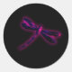 libélula azul oscura sobre un fondo negro, rodeada por un resplandor magenta.
