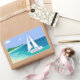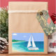 Pegatinas de playa tropicales de la costa de la lancha de vela de Monograma. Un velero con tu nombre en la playa se acerca a una playa. Vistas al mar tropical. Azul, verde azulado, espuma marina, turquesa, verde, blanco.